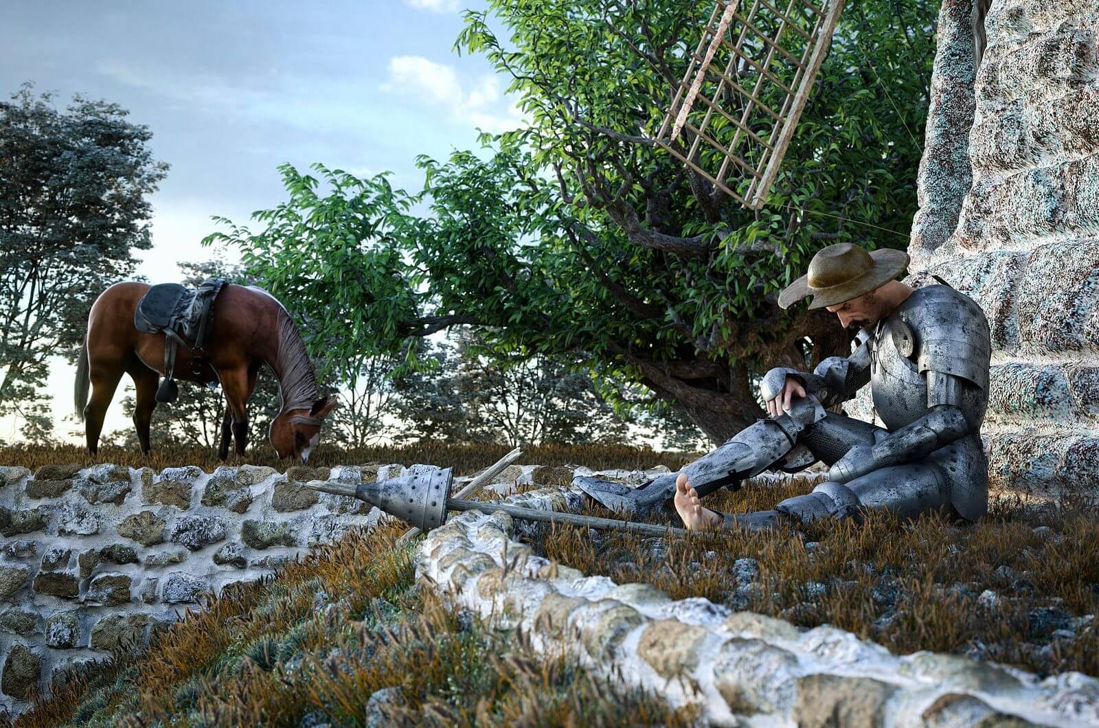 וכך, "דון-קיחוטה" של סרוונטס הוא הטרגי-קומדיה של מיושנוּת מסוימת, זו של אביר-משוטט בתקופה שהאבירות הייתה בה לרטוריקה ריקה מתוכן. אולם גדולתו של הספר מצויה למעלה ממלאכת חשיפת-פרצוף תלוית-זמן זו שהוא עשה. הספר מסיר את המסכה לא מן ה"שיגעוניות" של האבירות, אלא, על דרך ההרחבה, מן השיגעון שבכל הזדהות של העצמי עם "תבניות התנהגות ארכיטיפיות". במילים אחרות, לא קל יהיה לעצור את ה"קוסמים" של דון-קיחוטה משהחלו במשימתם הנוראה (אף כי, לגודל הפרדוקס, משימתם זו היא דווקא מה שמקס וֶבֶּר כינה לימים "הסרת הקסם"). כדברי דון-קיחוטה לסנשו באחת מדרשותיו שלא תיספרנה מרוב: "הייתכן שכתום כל הזמן הזה שאתה מתלווה אליי, טרם שמת לב שכל ענייני האבירים הנודדים דומים לחלומות, למעשי שטות ולהבלים, וכולם הפוכים, עליונים למטה ותחתונים למעלה? ולא מפני שכך הדבר באמת, אלא מפני שמתהלכת בינינו תדיר כת של קוסמים המהפְּכים ומשנים את הכול לטעמם ועל-פי נטיות לבם, אם להטות לנו חסד ואם להכחידנו. לכן, מה שנראה בעיניך כקערת גלבים נראה בעיניי כקובעו של מַמְבְּרִינוֹ ובעיני פלוני ידמה למשהו אחר".[8]